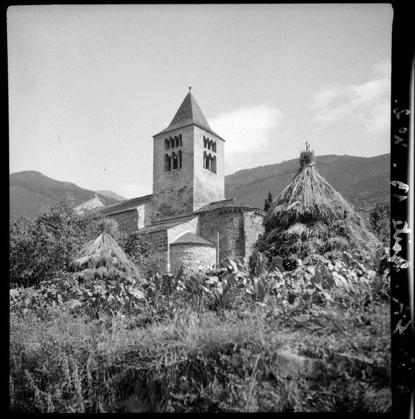 Edifice roman à une nef, avec transept et trois absides. Clocher sur la croisée, présentant sur chaque face deux rangées d'arcatures retombant sur des colonnettes en marbre ou diorite. Le rang du bas comprend trois arcatures, celui du haut en compte quatre plus étroites. Important décor intérieur. La porte est abritée par un large porche construit à la fin du 16e siècle.