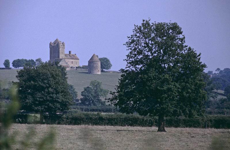 Monument emblématique de l'architecture militaire médiévale du Charolais. L'ensemble se développe autour d'une cour et se compose d'une haute tour quadrangulaire coiffée d'une toiture en pavillon et flanquée de quatre échauguettes circulaires. Sur la façade est de la tour maîtresse est accolé un corps de logis. Cheminées monumentales. Au sud de cette enceinte s'élève une tour circulaire abritant une chapelle et un pigeonnier... suite