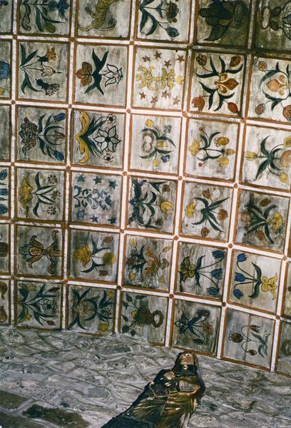 De l'église romane, qui comprenait une nef et deux collatéraux, ne subsiste que l'abside terminée par un mur droit, une travée de choeur et deux absidioles voûtées en cul-de-four. L'édifice fut ravagé une première fois par les Anglais ; les voûtes de la nef et des bas-côtés s'effondrèrent. Les travaux de réparation furent réalisés au 15e siècle, et construits les chapelles, le porche de deux travées qui supporte le clocher et le pignon occidental. Au 16e siècle, reprise des travaux avec élévation des quatre piliers circulaires avec l'intention de rétablir les voûtes en maçonnerie. Mais au cours des guerres de Religion, les toitures furent incendiées. Au 18e siècle, les nefs sont terminées en les couvrant d'une voûte en bois surbaissée. La voûte est divisée en caissons au moyen de moulures rapportées. La nef compte 560 caissons, et les collatéraux 400, tous décorés de peintures naïves représentant des fleurs, des animaux fantastiques, des angelots et les armoiries des familles du pays. Dans l'abside romane rectangulaire, voûtée en berceau, subsistent quatre colonnettes dont les chapiteaux ont un caractère très archaïque.
