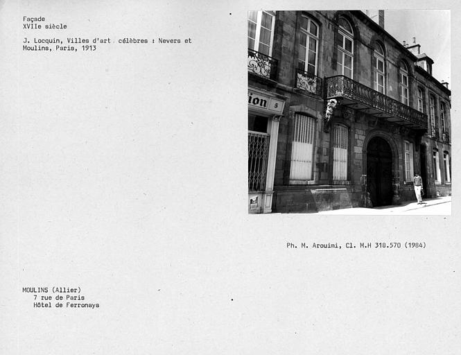 Hôtel du 17e siècle, mentionné dès le 15e siècle, composé autour d'une cour rectangulaire que ferme l'aile basse des communs. Les trois façades sur cour sont en briques noires et rouges, et en pierre, caractéristique de l'architecture civile moulinoise de cette époque. Passage voûté en anse de panier menant sur la rue. A l'intérieur, une rampe en fer forgé borde un escalier à huit volées droites desservant les étages. Chaque... suite