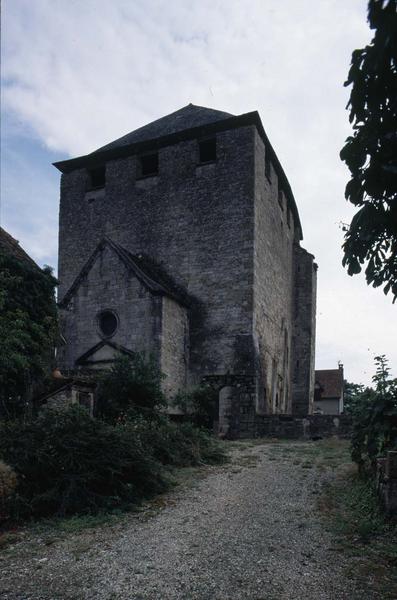 Cet édifice pourrait être le résultat de la réunion d'une église à une forteresse. Les murs extérieurs, de plan presque carré, sont surmontés de créneaux qui devaient autrefois se retrouver sur les quatre faces. Les arcs de la nef présentent un commencement d'ogive. Les parois du choeur présentent une sorte de triforium, avec colonnettes ornées de personnages. L'église fut donnée en 889 au monastère de Figeac par l'évêque... suite